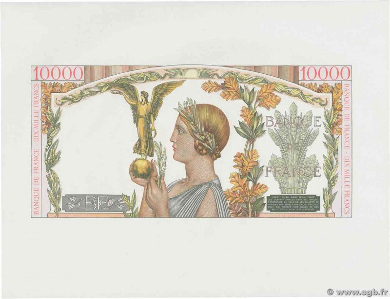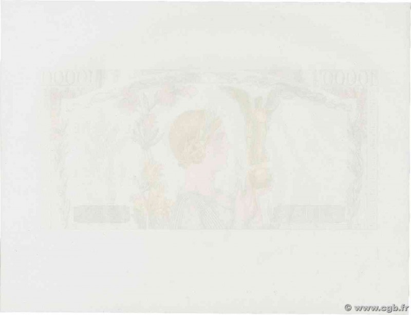 Proof note 10000 Francs Victoire 1939 NE.1939. The depletion of banknote stocks following the events of 1938 led the Bank of France to urgently launch the development of 300 Franc, 3,000 Franc, and 10,000 Franc notes. This urgency prompted the design department to re-use the vignette from the 5,000 Franc Victoire note and transform it into a 10,000 Franc note, enlarging the vignette and adding a line of text on the left and right.