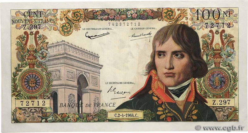 100 Nouveaux Francs Bonaparte 1964 F.59.26. Exceptional condition; only two other examples of Z.297, numbers 72705 and 72706, are listed in the Fayette/Kajacques inventory with this same pristine condition.