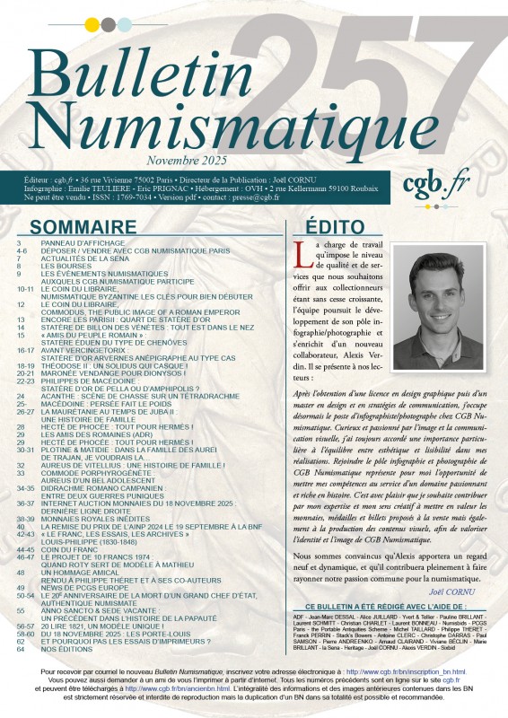 Our free monthly numismatic webzine Bulletin Numismatique n°257, November 2025, is published! Here is the editorial of CGB Numismatique Paris CEO and chairman, Joël Cornu and the table of contents.